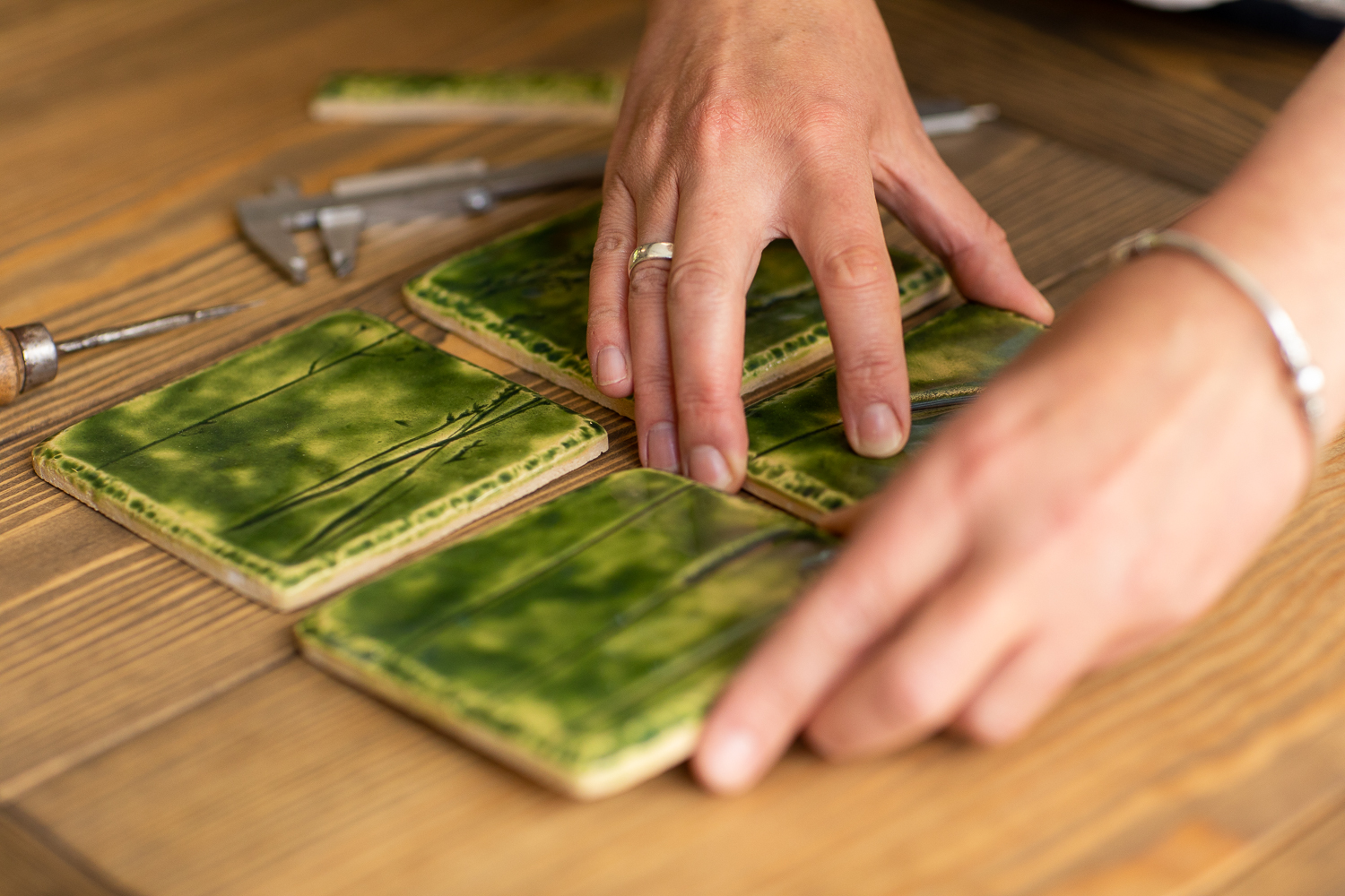 Kiedy pszczoły odpoczywają po ciężkiej pracy, my nie próżnujemy. Od jesieni zaczynamy nasz rzemieślniczy sezon. Moją miłością okazała się glina i powstająca z niej ceramika. Tworzę elementy ceramiczne, które Tomek wykorzystuje w meblach z litego drewna, które powstają w pracowni Swerk.